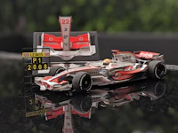 Well 2008!! After the disappointment of missing out on the title in 2007, this year was a great year...Was so close in Brazil, but after overtaking Timo on at the very last moment, shaped this Man from Stevenage carrier! Here we have a General release half scale helmet with lots of extras. 1:18 MP4/23 with a 1:18 Pit board and 1:12 Amalgam Nosecone.